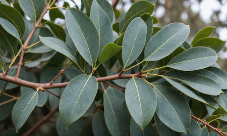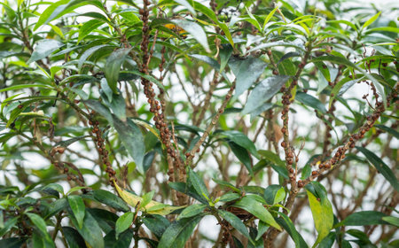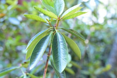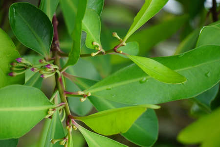 Indonesian dark wood, Ebony (Diospyros celebica) green leaves, and flower buds, selected focus