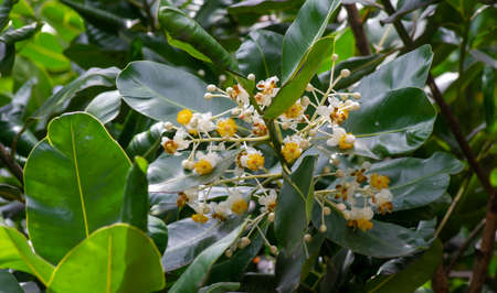 Calophyllum inophyllum flowers and leaves, a large evergreen plant, commonly called mastwood, beach calophyllum, on wood table