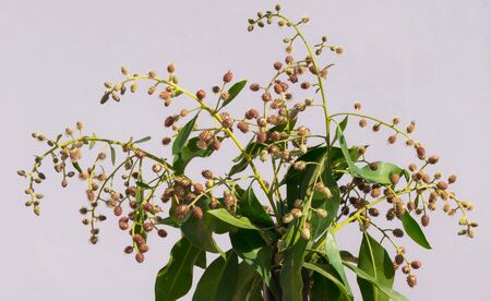The Longan flower bloomed and is growing as a young fruit on the tree in the garden. On a natural background.