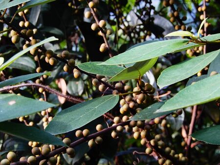 Male flowers of bay or true laurel, Laurus nobilis, growing in Galicia, Spain