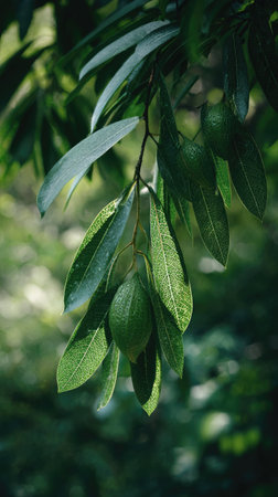 The Clove tree in spring, fresh green leaves, soft sunlight filtering, vibrant atmosphere full of vitality, natural textures, serene mood.