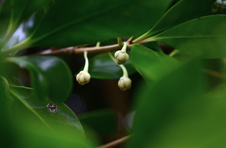 Japanese ternstroemia tree. Pentaphylacaceae evergreen tree. A symbolic tree known as the king of garden trees in Japan. It blooms with fragrant white flowers in summer.