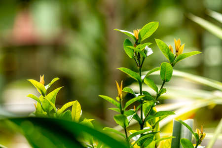 The Ixora in spring, fresh green leaves, soft sunlight filtering, vibrant atmosphere full of vitality, natural textures, serene mood P.