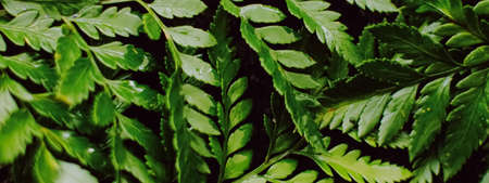 Perfect natural young fern leaves pattern background. Dark and moody feel. Top view. Copy-space.