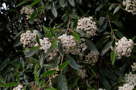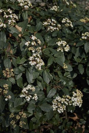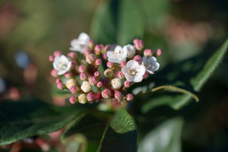 Plant Laurustinus with flowers outdoors with daylight Viburnum tinus