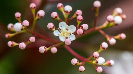 Japanese photinia (Photinia glabra) flowers. Rosaceae evergreen tree. In early summer, it produces cymes with numerous small white five-petal flowers.