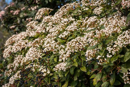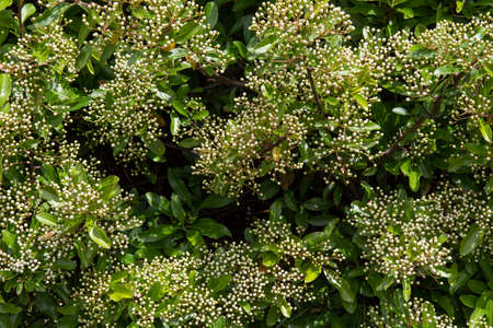 Dense green hedge with small white blossoms creates a beautiful backdrop. A lush, vibrant hedge filled with green leaves and clusters of small, white flowers, perfect for a natural background.