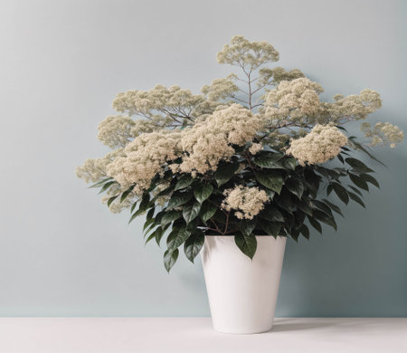 Close-up view of a flowering plant with small, pale white flowers and lush green leaves, set against a soft teal background, emphasizing the natural beauty and detail of the subject.
