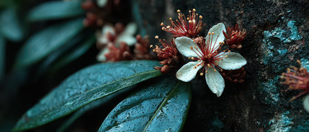 Delicate white flowers and reddish buds adorn the lush green leaves of a tree in a vibrant rainforest setting after rain.