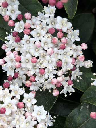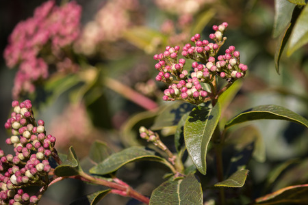 Laurastinus, Viburnum tinus in flowering, evergreen shrub with opposite ovate to elliptic leaves and small white to pink flowers in cymes, pink in bud