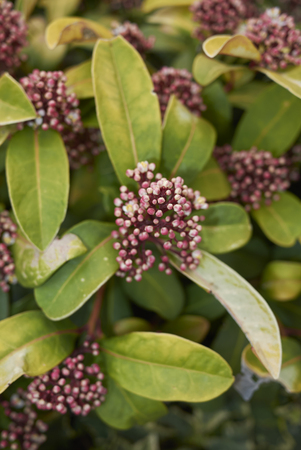 Flower buds and evergreen leaves of a Viburnum tinus shrub