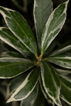 close up of a small branch or cluster of textured leaves with green and white variegation. likely a pieris japonica plant
