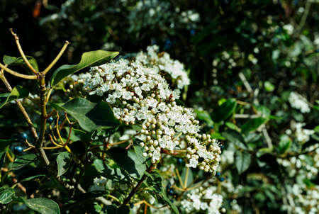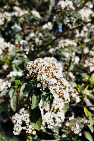 Viburnum tinus (Laurustinus), Close up white flower blossoming in the garden with sunlight. Mediterranean flower tree