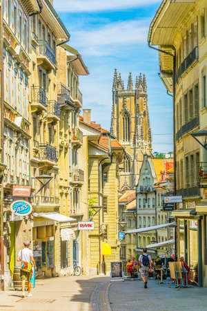 FRIBOURG, SWITZERLAND, JULY 17, 2017: People are walking towards the Saint Nicholas cathedral in the old town of Fribourg, Switzerland