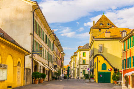 NYON, SWITZERLAND, JULY 19, 2017: View of a narrow street in the swiss town Nyon, Switzerland