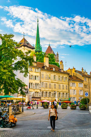 GENEVA, SWITZERLAND, JULY 20, 2017: View of a narrow street in the swiss city Geneva, Switzerland