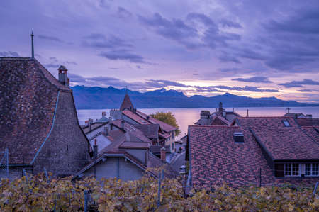 Lavaux, Switzerland: Little town, Lake Geneva and the Swiss Alps landscape seen from Lavaux vineyard tarraces in Canton of Vaud