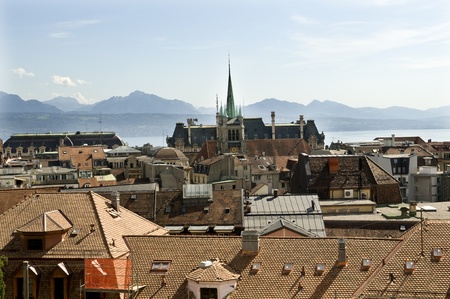 Lausanne cityscape with Saint-Francois Church and Lake Geneva and the French Alps at the background, Lausanne, Switzerland.