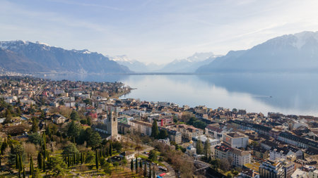 Panoramic aerial view of Montreux, Lake Geneva and Vevey
