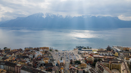An aerial view of dense buildings near the water on the background of mountains and clouds in Vevey, Switzerland