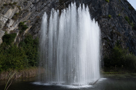Beautiful fountain spray at sea blending in with stripes of clouds on blue sky