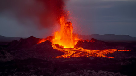 A vibrant display of fiery orange lava streams across dark, solidified terrain, sending sparks into the night sky amid an erupting volcano's fierce energy.