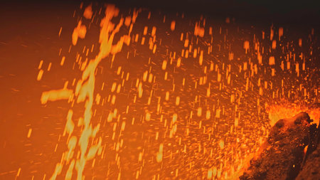 Detailed view of an active lava flow, hot magma emerges from a crack in the earth, the glowing lava appears in strong yellows and reds. lava ocean entry in the morning.
