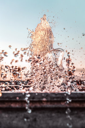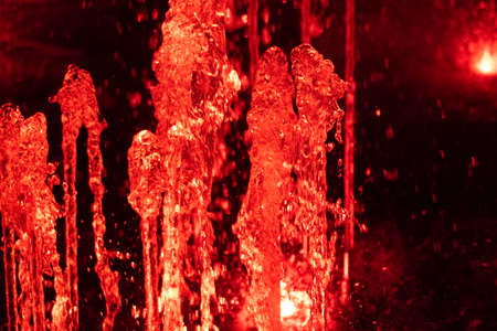 Colorful water in the singing fountain. Colored light splashes closeup during the fountain show at night.