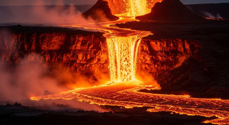 Glowing streams of molten lava cascade over rugged volcanic stones, illuminating the dark terrain with fiery brilliance and intense heat.