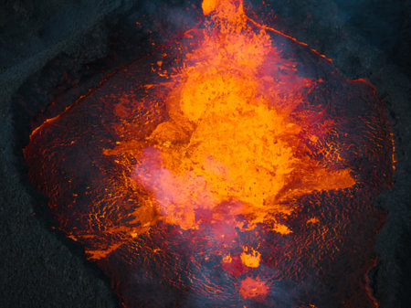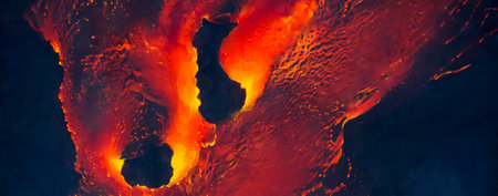 Erupting volcano, red hot boiling lava pouring out of crater into the devastated surrounding area, drone shot. Earth, nature, and power concepts.