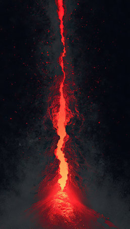A blazing crimson flow weaves through blackened terrain, illuminating the night with intense heat and wild energy amidst a volcanic upheaval.
