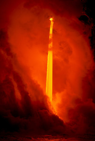 Hawaii. Volcano eruption. Hot lava flows into the waters of the Pacific Ocean.