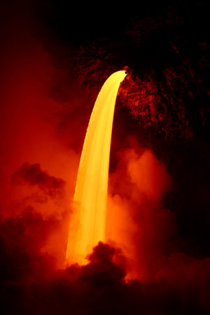 Hawaii. Volcanic eruption. Fiery lava flows into the ocean