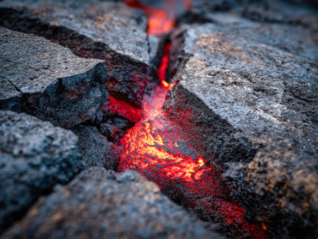 Fiery molten flow radiates intense light through jagged, shadowed volcanic fractures during dusk, capturing the raw power and vivid glow of Earth's restless interior.