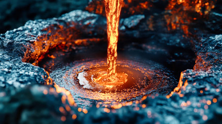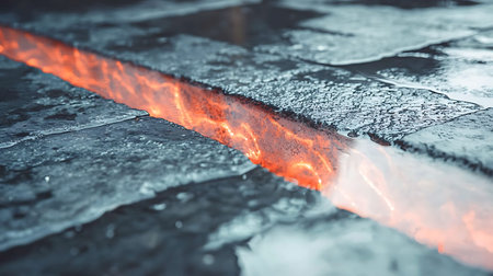 A stunning visual of lava flowing through a cracked icy surface, showcasing the powerful contrast between fire and ice, capturing nature's raw energy.