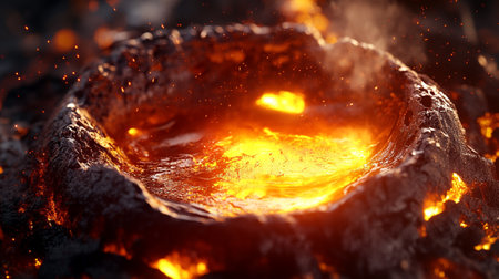 Fiery molten rock bursts from a volcanic vent, illuminating surrounding rugged black stone with a glowing, intense heat radiance.