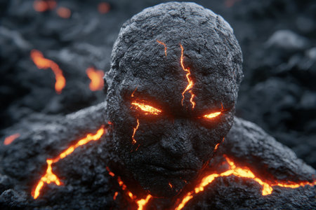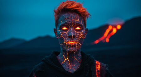 A captivating visual of a face fused with lava, highlighting intricate cracks and glowing patterns. This artwork embodies the dynamic interplay between humanity and nature.