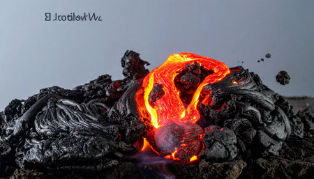 Witness the raw, elemental power of creation as incandescent molten lava carves a new path over cooled, black volcanic rock.