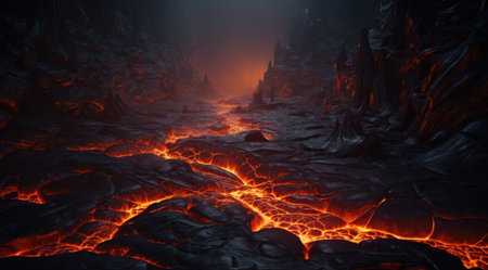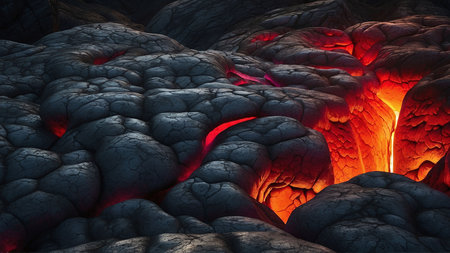 A Dramatic volcanic lava flow with glowing red and black textures creates mesmerizing and intense natural scene