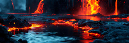 Underground embers: Glowing lava flows run through the nighttime landscape, copy space.