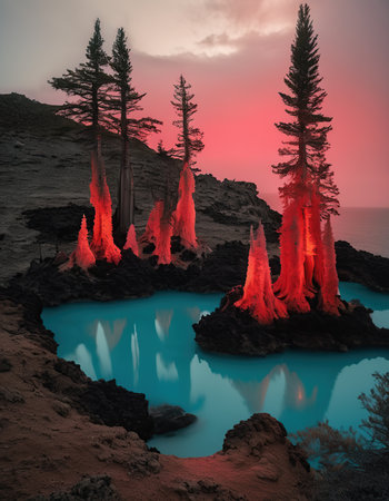 A vibrant red geothermal pool surrounded by rocks in a volcanic landscape, with a dramatic teal sky overhead, symbolizing the raw power and beauty of Earth's hot springs