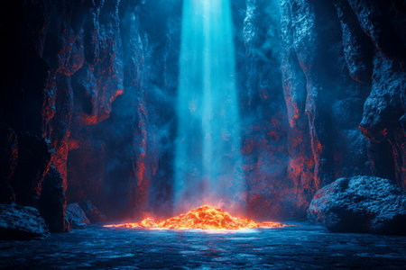 A fiery magma burst illuminates a shadowy cavern, with eerie blue glow filtering through jagged rock formations, creating an intense, mystic atmosphere