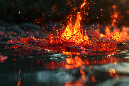 This captivating image showcases a striking lava flow illuminating dark stone with vibrant red and orange colors, creating a dramatic and mystical atmosphere.