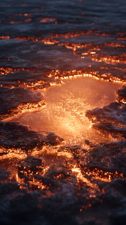 Molten rivers cascade along rugged shores as twilight deepens, casting an intense glow that highlights the dramatic clash between fiery earth and fading light.