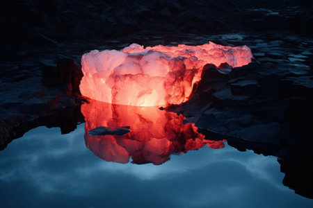 Glowing iceberg reflected in dark water. Arctic, serene, cold.