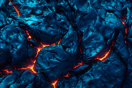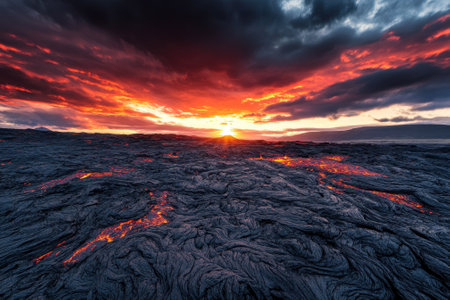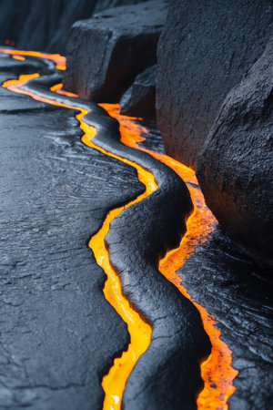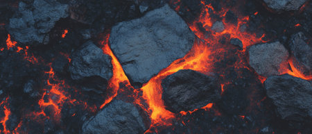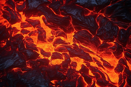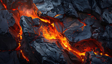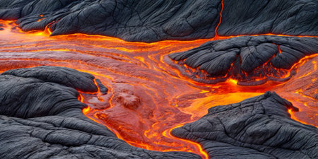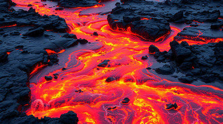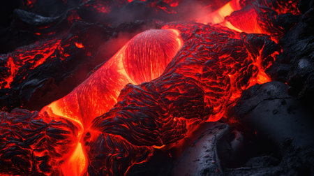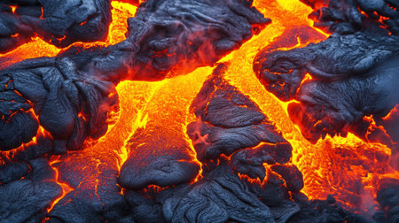 A Dramatic volcanic lava flow with glowing red and black textures creates mesmerizing and intense natural scene