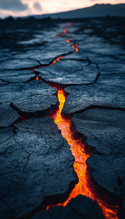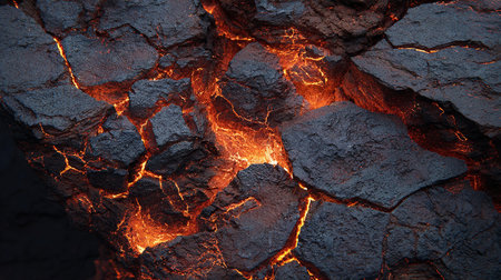 Cracked Earth, Burning Heart Close-up of Orange Lava Glowing Through Dark Grey Volcanic Rock.