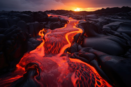 Molten lava streams between jagged rocks, glowing brightly against the dark landscape at twilight. The heat radiates, creating a mesmerizing sight of nature's power and beauty.