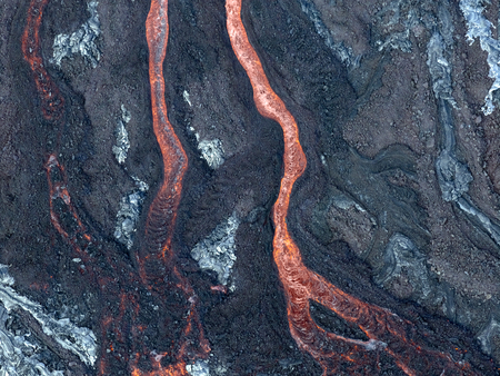 Streams of red hot lava flowing during a volcano eruption, toxic smoke covering the volcanic black field, aerial shot. Concepts of abstract patterns and backgrounds.