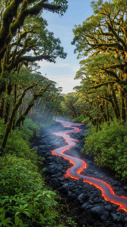 A blazing crimson flow weaves through blackened terrain, illuminating the night with intense heat and wild energy amidst a volcanic upheaval.